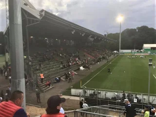 We had beers and a bratwurst before heading up onto the open terrace. This was a semi-permanent construction and a new addition from my previous visit. The far end had extra paraphernalia to accommodate the live TV coverage and looked more like part of a rugby union venue back home.